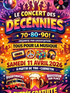 En ce moment 11 Avr 2026 Vie municipale Concert des décennies Concert des décennies Samedi 11 avril 2026 à partir de 19h Cour de la mairie Entrée gratuite Address: Mairie de Carnetin